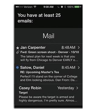 在iOS7系統中,Siri實際上可以向用戶讀出整篇郵件,不僅僅是標頭信息。比如,你可以說,“讀出我最新一份郵件”,或者“讀出我的新郵件”,Siri就會大聲讀出你最新的郵件信息。此外,Siri還“邀請”用戶對郵件做出回復。