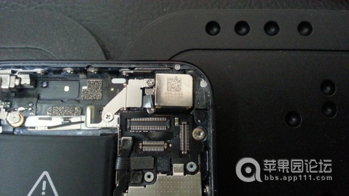 iPhone5的拆解很容易,網上也有現成的教程。下面是拆下前面的液晶屏之後的樣子。右上角四四方方的就是主攝像頭!