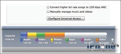 一般情況下,這裡占用空間最大的一個類別是“其他”,但你知道在iTunes上顯示的關於iPhone的彩色圖形代表什麼意思嗎?其實這裡包含了高速緩存、備份、部分下載文件還有一部分iOS 7內置應用程序的數據,比如短信和電子郵件。