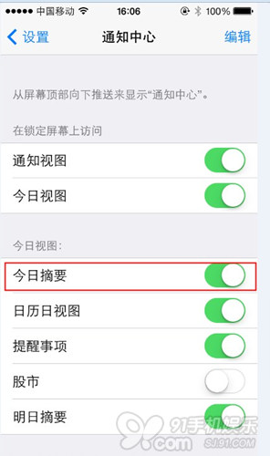 2.如果還是沒顯示的話,大家可以點擊“設置”--“通知中心”--“今日視圖”--“今日摘要”,打開就行了。
