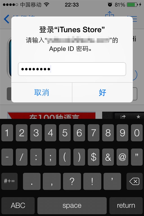 第三步:點擊價格按鈕後該按鈕會隨即變為“購買”,再次點擊它會後會提示輸入你的蘋果賬戶密碼。