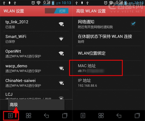 在“設置 > WLAN設置”裡面,點擊“菜單鍵”,會彈出“高級”選項。裡面就能查看到MAC地址。