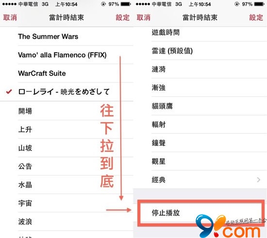 接著就會看到選取計時鈴聲的畫面,這時候只要往下拉到底,選擇「停止播放」。接下來只要設定好時間,就會在倒數計時完畢後自動將音樂停止並讓手機關閉屏幕喔!