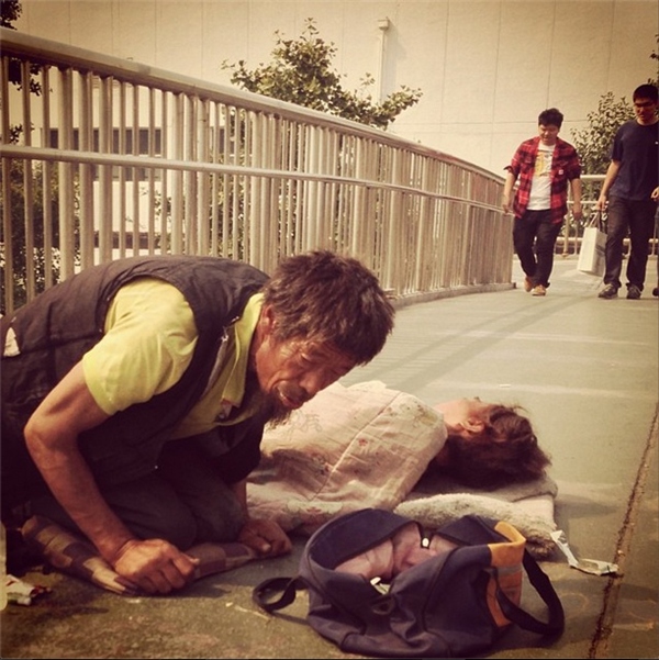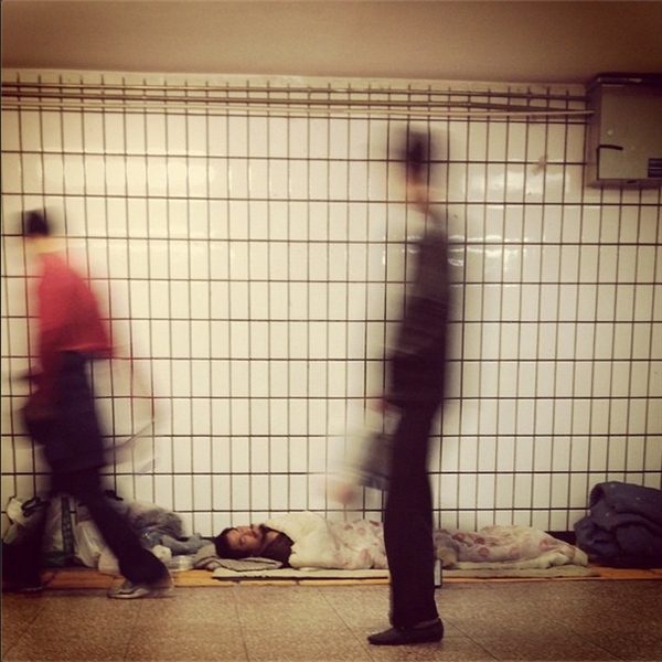 地下通道躺著的男子與行色匆匆的路人形成對比。