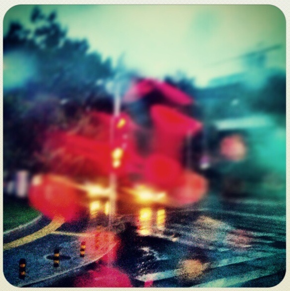 外面下著雨,隔著車窗拍車尾燈。