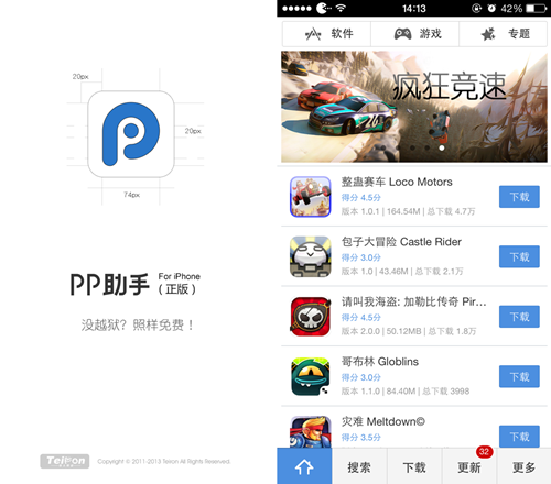 iOS7.1帶來大量的改進優化的同時也使我們與越獄暫別,不能越獄的iOS7.1設備仍然可以使用PP助手正版下載海量正版應用,更加穩定更加高速,無需登錄無需注冊Apple ID,直接一鍵快速下載安裝。