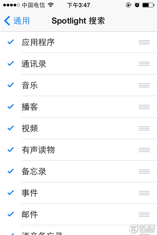 同時,我們還可以設置Spotlight的搜索范圍。進入“設置--通用--Spotlight搜索”即可自定義設置。