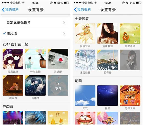 新版QQ允許用戶自定義個人資料頁面背景,點擊背景即可進入該功能,其中包括靜態圖、動態圖、動畫以及黃鑽專屬的七天換裝版背景,並支持自定義,方便用戶打造個性化資料卡。