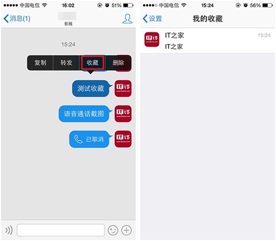 iPhone版QQ v4.6增加了“我的收藏”功能,用戶在聊天中通過長按聊天信息即可進行收藏操作,收藏內容可以在設置界面“我的收藏”中查看。該功能由騰訊微雲提供支持,收藏內容可同步至電腦端。