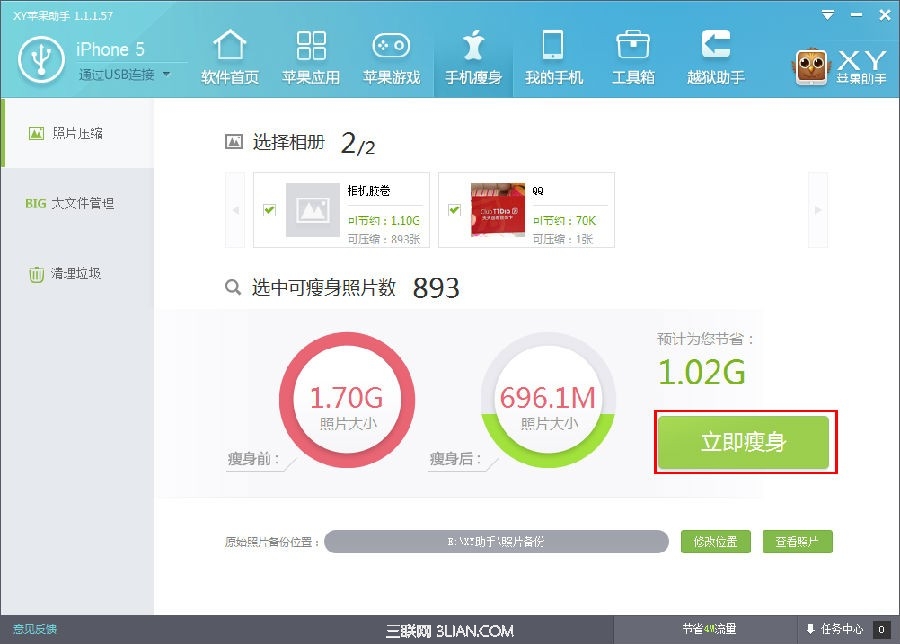 3.待XY手機助手掃描完畢後,便會顯示可瘦身結果,點擊“立即瘦身”按鈕便可馬上進行照片的壓縮與備份工作,以幫您完成手機的瘦身工作。
