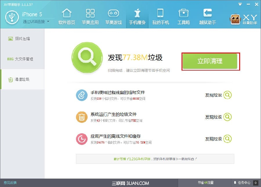 2.待掃描完畢後,XY蘋果助手會顯示出您手機中需要清理的垃圾文件,點擊“立即清理”按鈕便可輕松清理掉這些垃圾文件。幫您的手機提升速度,節約出更多空間。