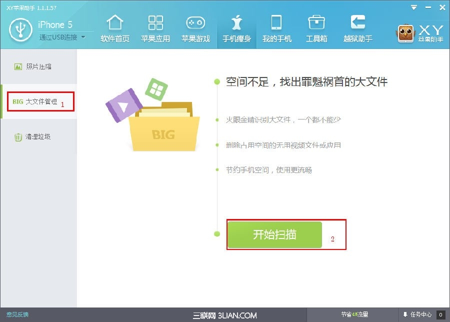 1.在手機瘦身中選擇“大文件管理”,然後點擊“開始掃描”按鈕。XY蘋果助手便會開始掃描那些大文件了。