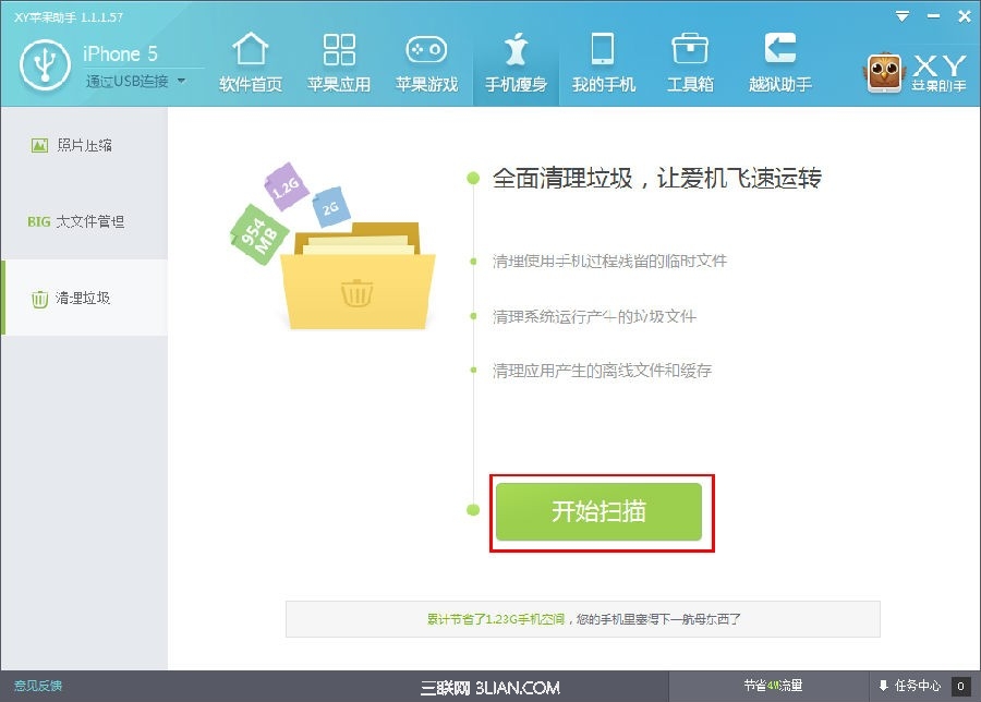 1.在手機瘦身中選擇“清理垃圾”,然後點擊“開始掃描”按鈕。XY蘋果助手便會開始掃描那些需要清理的垃圾文件了。