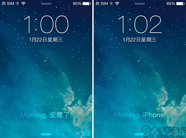 iPhone 鎖機界面 "滑動來解鎖" 文字修改的 Cydia 插件非常多,比如 LabelSlider、Lnternalizer、customLS 或 iSlideText,不想安裝 Cydia 插件的話,可以使用91助手進入 iPhone 文件目錄中修改 SpringBoard.strings。