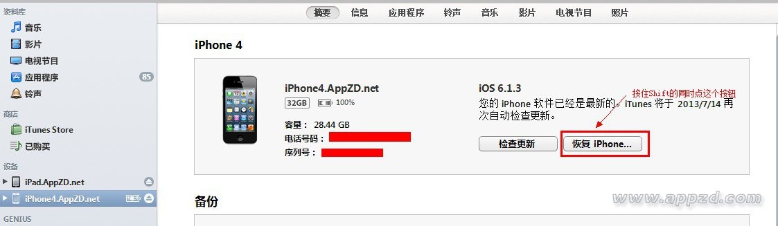 這時候打開iTunes,用數據線連接上電腦,按住Shift的同時點擊恢復按鈕