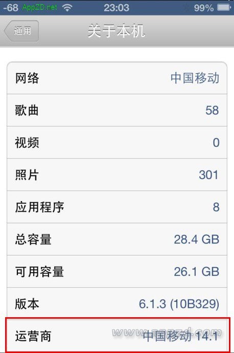 第一項是運營商版本,查看運營商版本打開 設置 -> 通用 -> 關於本機,翻到最下面有一項運營商,如我的顯示的是中國移動 14.1,則14.1就是版本號,填入14.1即可(默認的應該是中國移動14.0,但更新一次數字就會加0.1,我的設備是更新之後截的圖,所以已經變成14.1了)