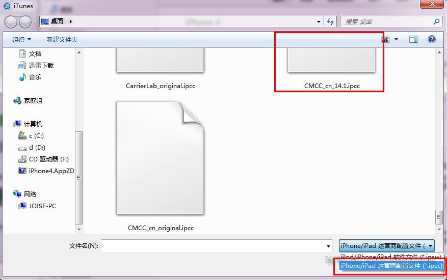 在彈出的窗口中選擇桌面上的IPCC文件,這時候要注意將文件選擇窗口中的文件後綴設置為選擇IPCC文件,如下圖: