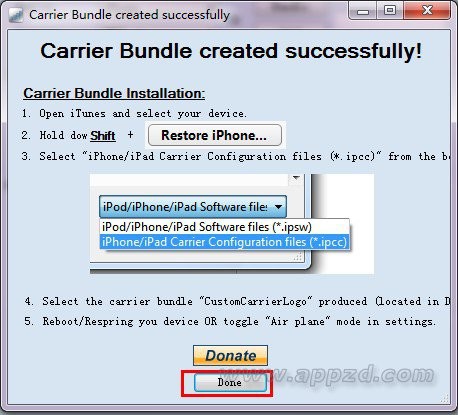 參數設置好之後,點擊Create IPCC Carrier就會在桌面生成相應的IPCC文件,並彈出一個框提示如何將該文件應用到你的設備中,點擊Done即可