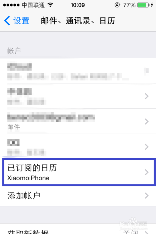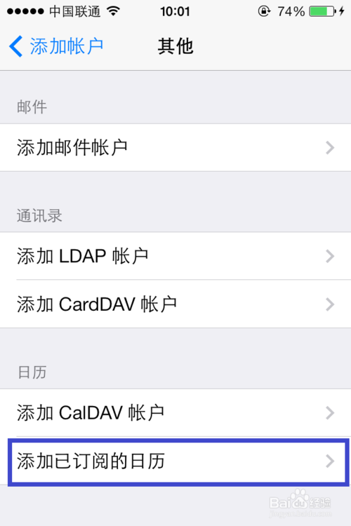 4、在日歷設置列表中,點擊“添加帳戶”選項,如圖所示