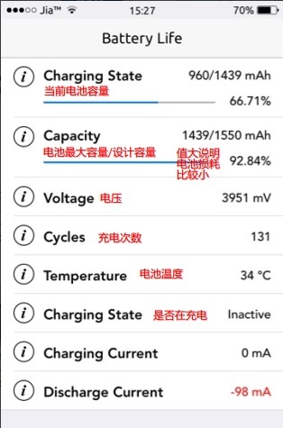 支持設備:iPhone5s/5c/5/4s/4,iPad尚不支持 插件介紹:支持顯示當前電池電量,已經最大容量,循環充電次數,溫度等信息,幫助你檢測電池的健康情況。