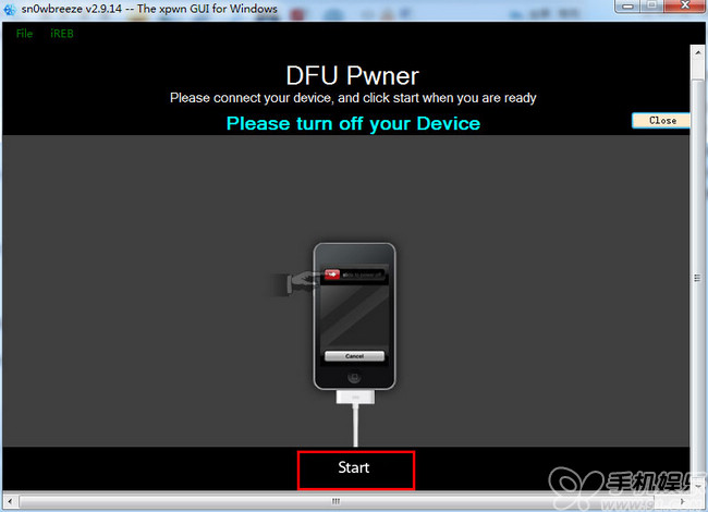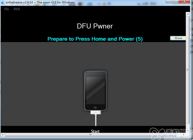 先將iOS設備關機後點擊【sn0wbreeze 雪花】降級工具的【Start】按鈕,然後按照提示步驟操作: