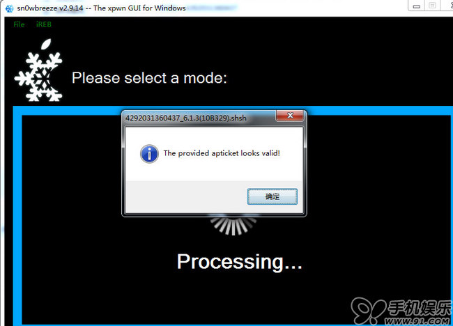 6.制作降級固件成功後將iOS 設備連接電腦並點擊【sn0wbreeze 雪花】降級工具點擊【OK】