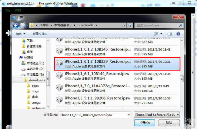 八、打開iTunes,按鍵盤Shift+鼠標左鍵點擊【恢復】選擇【sn0wbreeze 雪花】降級工具制作降級固件。