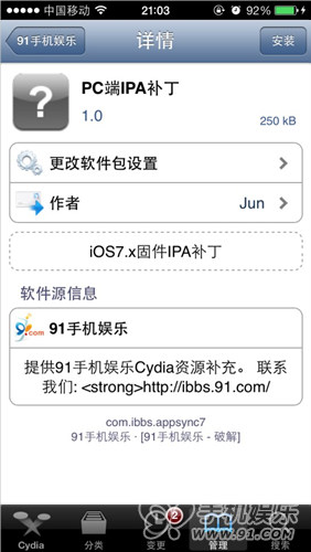 iOS7的越獄工具已經放出,我們無法安裝ipa的情況,這個時候請同學們先安裝appsync,可以利用91源更新。下面是詳細圖文教程
