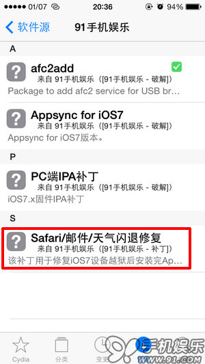 點擊新添加源apt.91.com/7/,進入如下界面,再點擊【Safari/郵件/天氣閃退修復】,再點擊右上角【安裝】—【確認】