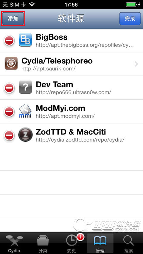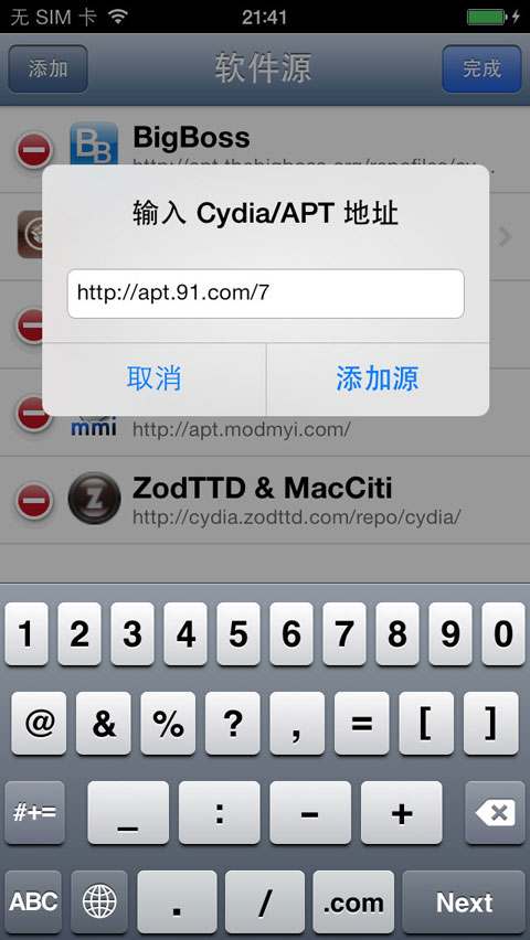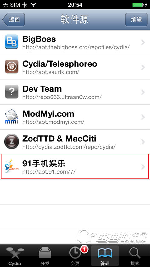 一、打開手機上的cydia -- 管理/軟件源 -- 編輯/添加--輸入源地址:apt.91.com/7