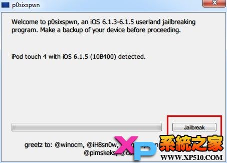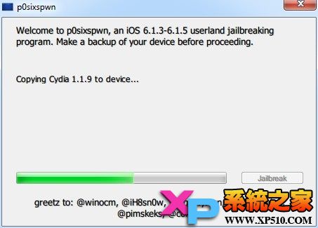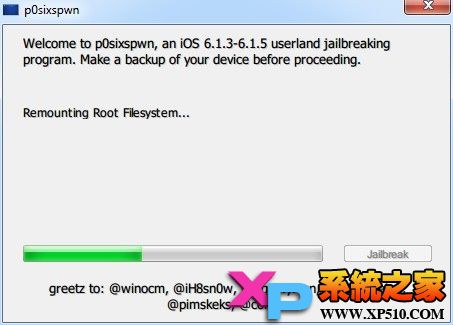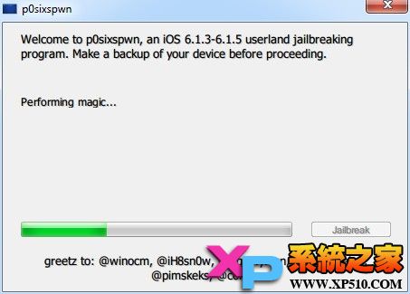2、點擊程序主界面的Jailbreak(開始越獄)按鈕,其他什麼都不需要做,然後就是等待設備自動重啟了: