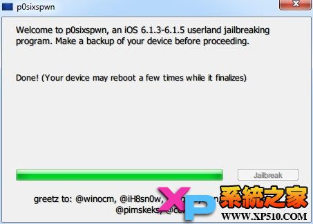 大約3~5分鐘時間,設備會再次重啟,程序提示越獄成功,之後設備還會重啟: