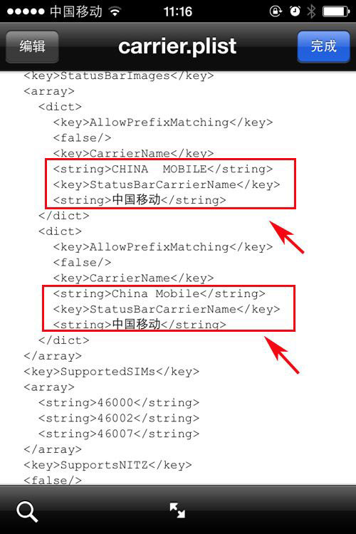 2、運營商圖標修改一般就如下面圖紅色標記所注,只需按照下圖代碼進行相應編輯就能恢復到修改前狀態,也就解決了ios7修改運營商圖標後不能連接蜂窩網絡的問題。