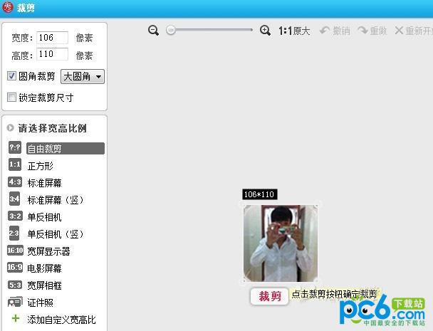 打開自己的照片,采用美圖秀秀編輯,點擊右上角裁剪,在裁剪裡面,設置寬度,高度(一般滑塊高度,寬度在110像素左右)