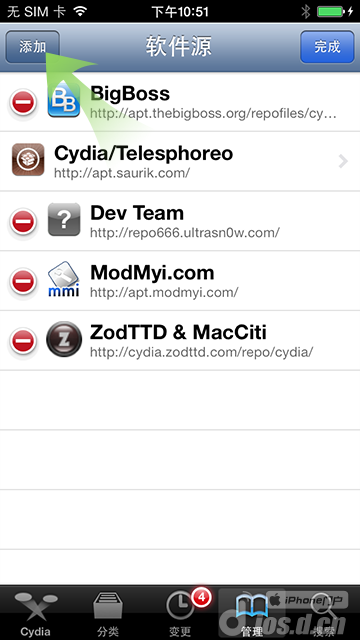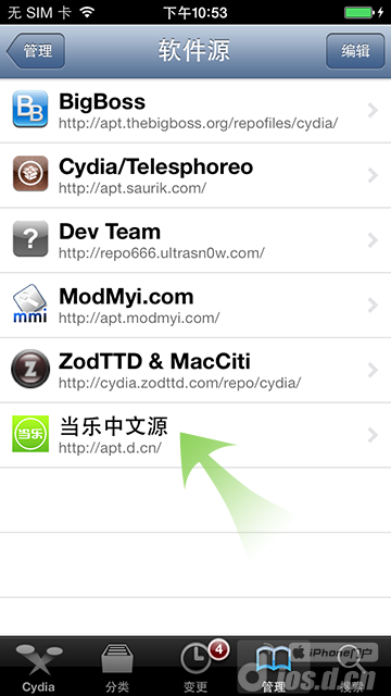 4.Cydia會自動加載數據,等待加載完成後依次點擊”管理“——”軟件源“——”編輯“——”添加“——輸入源地址”http://apt.d.cn“——”添加源“
