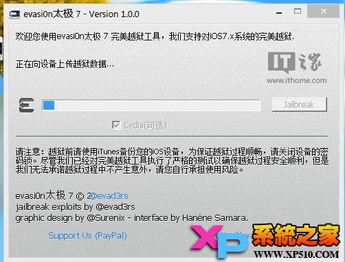 1、運行evasi0n7,同時將設備接入電腦;記得關閉電腦上的iTunes、取消設備的解鎖密碼。