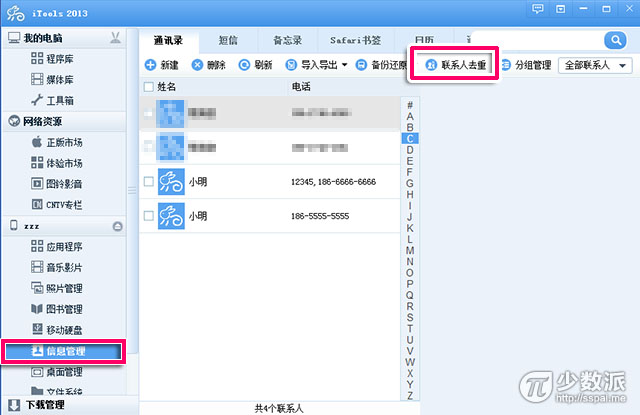 這個時候就要想起 iTools,用它我們可以快速合並重復聯系人。