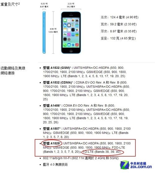 A1529 iPhone 5c支持TD-LTE