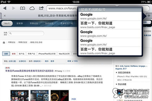 iPad 的 Safari 網頁浏覽器擁有一個獨特的功能,那就是在你長按網頁標簽欄最右側“+”即“添加標簽”的圖標時,Safari會彈出一個“最近關閉的標簽”窗口。該窗口會顯示5個你最近打開的網頁,相當方便實用。注意,iPhone/Mac 版的Safari都不具備該功能。