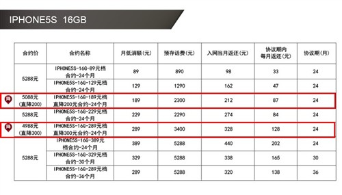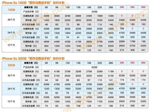 部分聯通iPhone5s"預存話費送手機"合約計劃