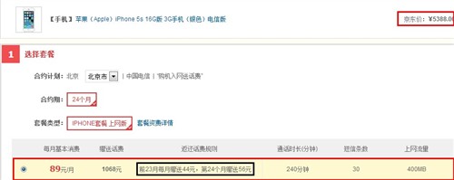通過對比京東商城中的最低檔電信合約機價格似乎便宜一些。以iPhone5s(16G)/89元檔合約/24月為例,電信官網的合約價雖然看似比京東商城要便宜100元,但在話費返還中與京東存在較大差距,最終用戶話費金額也比從京東商城中購買的合約機要貴出許多。