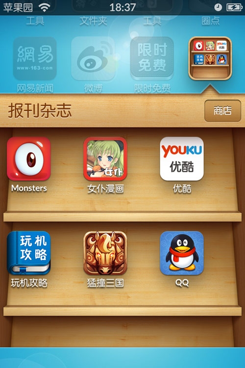 有些圖標你不太喜歡或者游戲不想讓其他人玩,如何把它們隱藏起來呢?利用iOS系統的小彩蛋,我們可以把不喜歡的圖標放到不引人注意的報刊雜志程序裡,然後再塞到文件夾深處,在這裡最最隱蔽。
