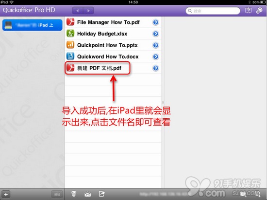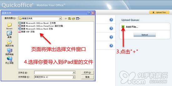第六步.使用91助手將文件傳入iPad如下圖操作,並用Quickoffice進行查看編輯