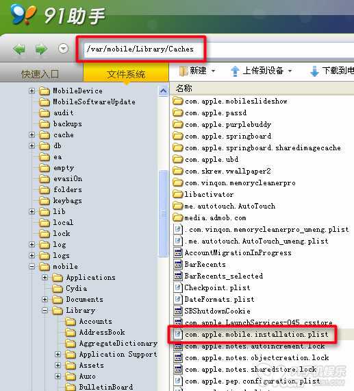 3.使用91助手搜索功能,找到文件com.apple.mobile.installation.plist