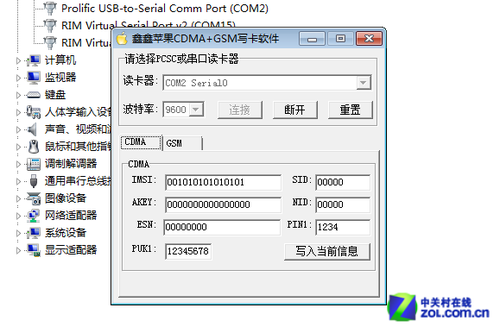 這裡注意筆者選擇的波特率為9600,因為過快的速率可能會導致鳳凰讀卡器讀取雙模卡失敗。同時讀卡器區域會顯示已經連接好的鳳凰讀卡器端口,並默認CDMA端。之後在IMSI部分輸入:001010101010101.此時點擊連接按鈕,之後點擊“寫入當前信息”按鈕。