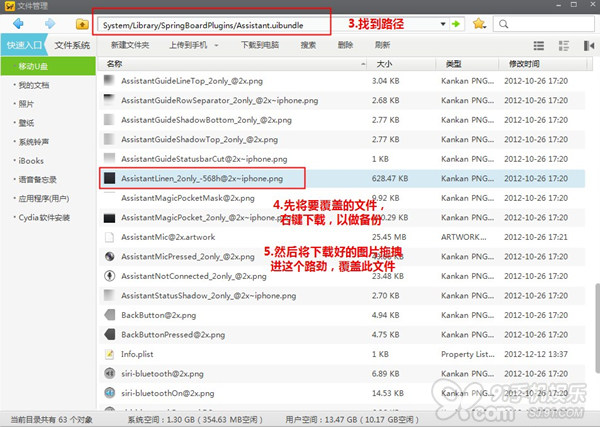 4.找到路徑【SystemLibrarySpringBoardPluginsAssistant.uibundle】,先備份文件,然後將圖片拖拽進91助手替換。