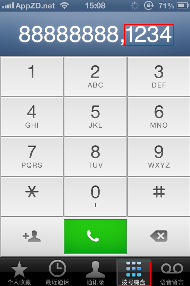 打開“電話”程序,輸入號碼後長按左下角“*”號按鈕,會出來一個“,”號,