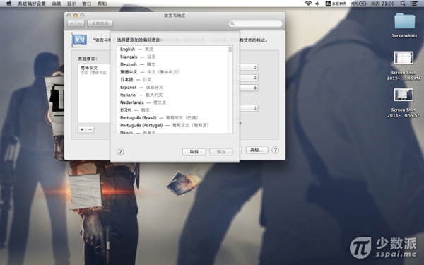 打開“系統偏好設置”,進入“語言與地區”設置項,在左側語言區添加“英語”,並將其設置為首選語言,重啟Mac。