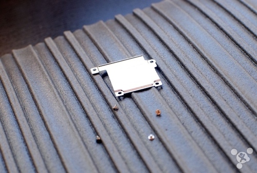 第六步,這塊金屬保護蓋下面埋著屏幕電線,我們要拆掉它才能把屏幕從機身拆出來。用的工具是 #000 十字螺絲起子。