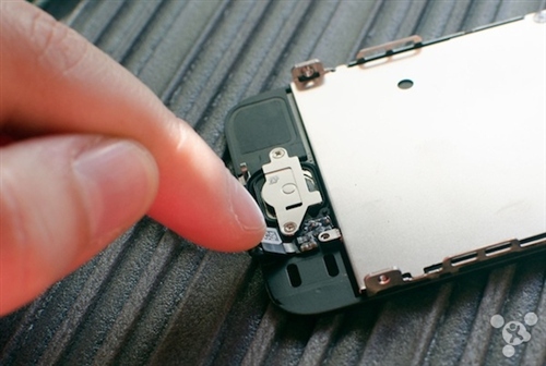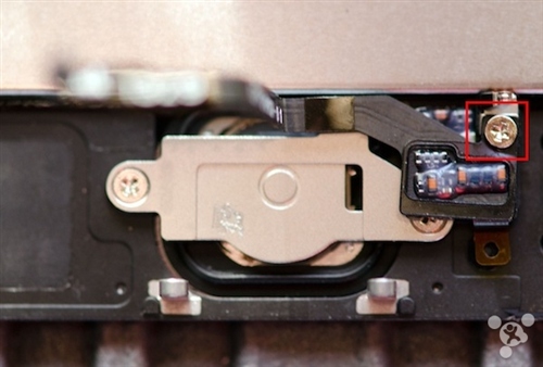 2,放下工具,現在用手扶著電線,可以慢慢把小金屬片掀開了。還有一塊大金屬片保護著 Home 鍵,擰開上面的兩枚螺絲釘,把大金屬片掀開。